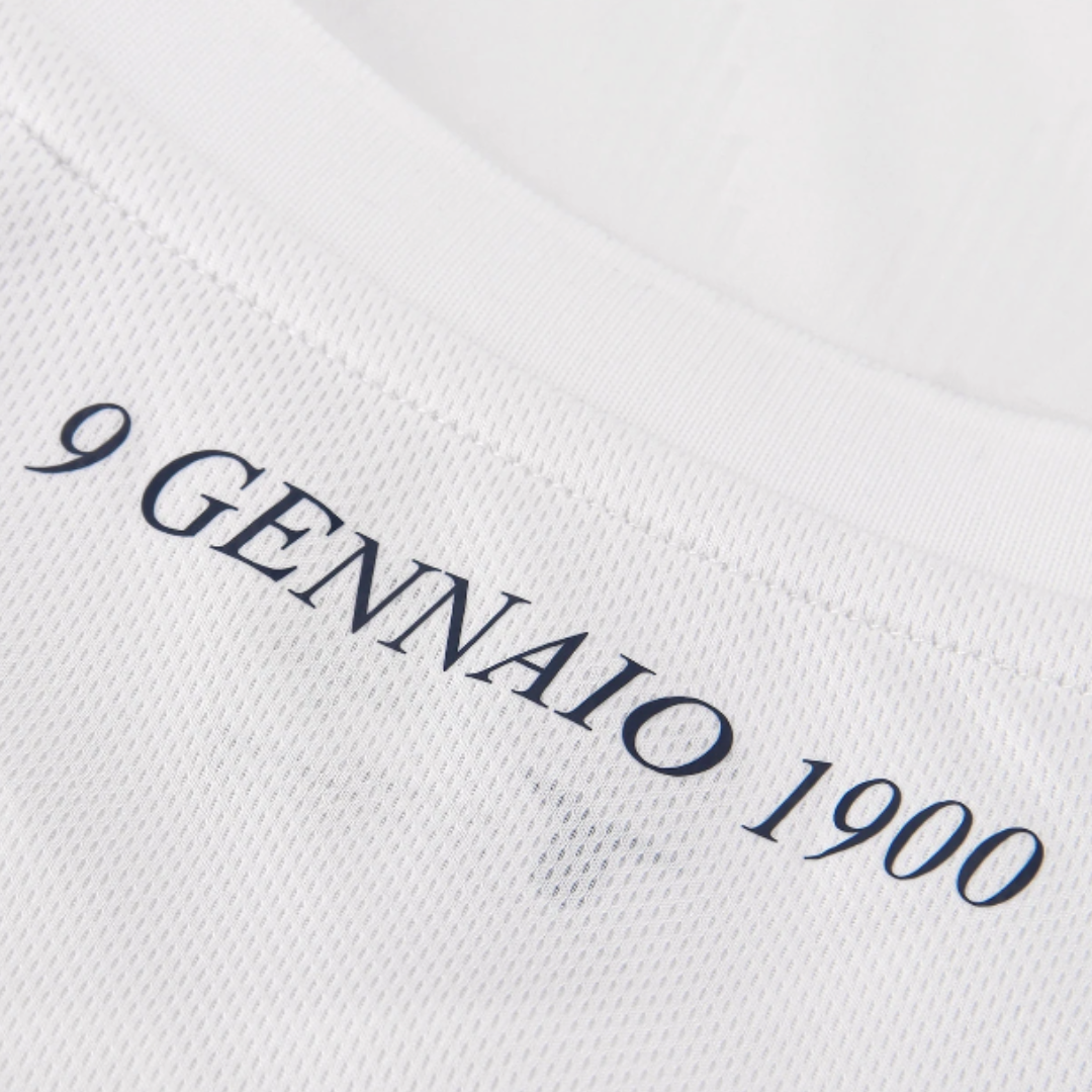 Il design elegante e minimal riprende le tonalità classiche del club con dettagli raffinati in oro, lo stemma celebrativo e un look vintage che unisce passato e presente in una sola maglia.