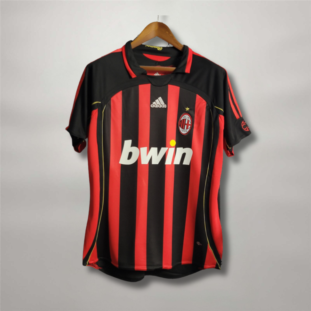 The design of the 2006/07 Milan home jersey is pure tradition: the classic red and black stripes, the bwin sponsor on the chest, the Adidas logo, and the official Milan crest with the celebratory star. On the back, Kaká's name and the number 22 stand out, which became iconic for all Rossoneri fans.